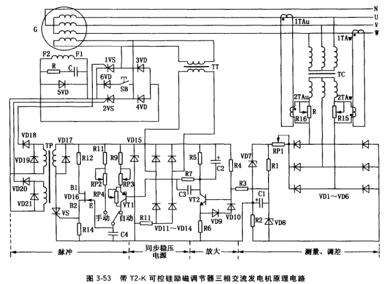 (2)原因分析。由于無刷發(fā)電機(jī)交流勵(lì)磁機(jī)的勵(lì)磁功率小,勵(lì)磁調(diào)節(jié)器通常使用單結(jié)晶體管觸發(fā)電路(見圖3-53),因此上述現(xiàn)象主要是由于可控硅勵(lì)磁調(diào)節(jié)器故障所致。