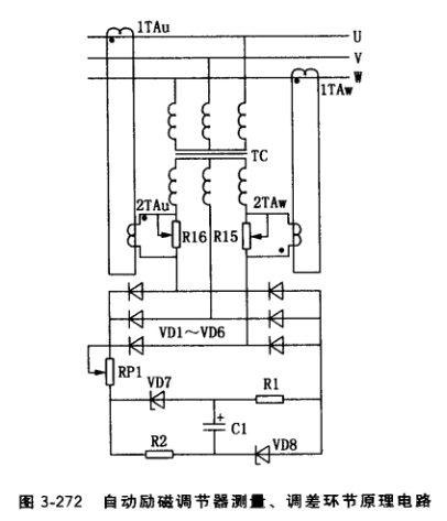 (2) 原因分析。可控硅勵(lì)磁調(diào)節(jié)器為了使發(fā)電機(jī)在并網(wǎng)運(yùn)行時(shí)能合理分配無功,一般都 設(shè)有調(diào)差裝置,在接線上有單相調(diào)差、兩相調(diào)差和三相調(diào)差等。下面就以兩相調(diào)差為例說明接線錯(cuò)誤引起無功電流一直上升的原因。圖3-272是勵(lì)磁調(diào)節(jié)器的測量、調(diào)差環(huán)節(jié)(調(diào)節(jié)器電路見圖3-53) 測量變壓器TC和測量橋VD1?VD6等組成了調(diào)節(jié)器的電壓測量環(huán)節(jié)。當(dāng)發(fā)電機(jī)電壓上升時(shí),測置橋輸出信號(hào)增大,此信號(hào)與比較橋(由R1、R2和VD7、VD8組 成)比較和放大器放大后,將使觸發(fā)脈沖后移,勵(lì)磁電流減小,從而使發(fā)電機(jī)電壓下降,恢復(fù)到接近原來的電壓值。相反,將使發(fā)電機(jī)端電壓增加,以維持發(fā)電機(jī)端電壓在一定范圍內(nèi)。