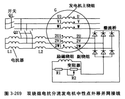 ②減弱相復(fù)勵(lì)作用。其方法有:減少電抗器一次繞組L1的匝數(shù)或增加二 次級(jí)繞組L2的匝數(shù),也可采用中性點(diǎn)外移法并網(wǎng),其接線如圖3-269所示。 操作方法如下:合上開關(guān)Q2,分開開關(guān)Q1,使發(fā)電機(jī)滿足準(zhǔn)同期并網(wǎng)條件, 并使發(fā)電機(jī)電壓高于電網(wǎng)電壓3?5V。 然后打開開關(guān)Q2,合上開關(guān)Q1,按準(zhǔn) 同期并網(wǎng)方法并網(wǎng)(即并網(wǎng)時(shí)不投入電 流復(fù)勵(lì))。最后打開關(guān)Q1,合上開關(guān)Q2.向電網(wǎng)送電。