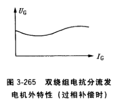 (2)原因分析。雙繞組電抗分流發(fā)電機(jī)一般副繞組滯后主繞組電角度10°,相補(bǔ)償作用強(qiáng),使發(fā)電機(jī)的外特性(即發(fā) 電機(jī)電壓UG隨電流IG變化的特性)下凹上拱,如圖3-265所示。而不同發(fā)電機(jī)的外特性不一致,又無調(diào)差裝置供調(diào)節(jié)用,因此造成并列運(yùn)行無功輸出不穩(wěn),無功分配困難。