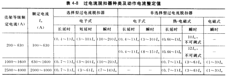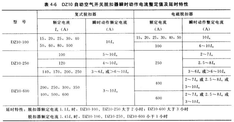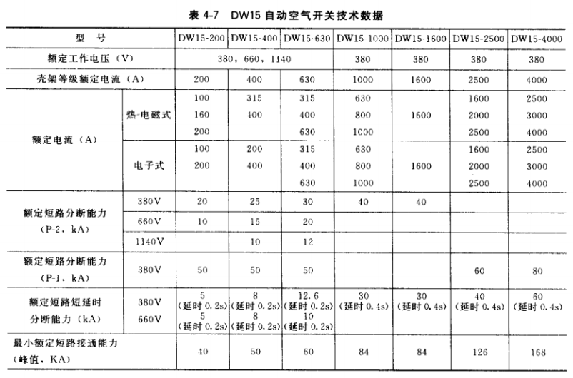 該系列自動空氣開關技術數據見表4-7,過電流脫扣器動作電流整定值見表4-8。