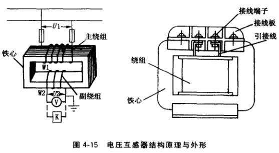(1)電壓互感器。電壓互感器的結構和普通變壓器相似,主要由硅鋼片疊成的鐵心和繞在鐵心外邊的兩個繞組組成,它將高電壓變成低電壓。圖4-15為單相電壓互感器結構原理與外形。其中繞組W1為主繞組,與被測量電壓連接。W2為副繞組,為儀表、繼電器提供 100V電壓。因為流過副繞組的電流很小,相當于工作在空載狀態的變壓器,所以,電壓互感器可視為理想的變壓器。由于變壓器工作于空載狀態,內阻抗壓降很小。主繞組側電壓 U1與副繞組側電壓U2的比值稱為電壓互感器的變比。因為電壓互感器是將高壓變低壓, 當電壓互感器繞組絕緣擊穿時,在副繞組側會出現高電壓,為了安全起見,電壓互感器副繞 組回路和它的外殼均須接地。