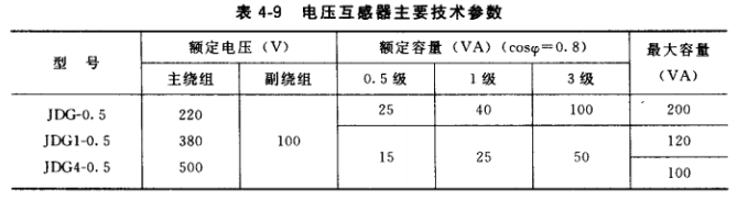 ②電壓互感器的額定容最應大于負載的最大容量,以保證具有相應的準確度。電壓互感 器在不間準確度時的額定容量見表4-9。