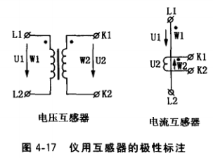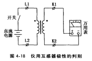 (3)互感器的極性及其判別。電壓互感器和電流互感器的極性表示其主、副繞組的相對繞法關系,如果繞向相間,則兩個繞組的頭(或尾)稱為同極 性。儀表用互感器是按減極性標注的,即當主繞組 和副繞組同吋由同極性端子通人電流時,電流在鐵 心中產生的磁通方向相同,如圖4-17所示,用L1和 K1 (或用?)表示主、副繞組同極性端子。當電流 從主繞組端子L1流入時,在副繞組中感應的電流應 從同極性端子K1流出。根據這一原理,可判別出互 感器繞組的極性,如圖4-18所示。在互感器的主繞 組接上直流電源和開關,將副繞組與萬用表的直流 mA擋連接,并假設互感器的極性如圖中所示。合 上開關的瞬間,萬用表指針向正方向(即向右)偏 轉說明假定的極性是正確的,萬用表指針向負方向(即向左)偏轉說明假定的極性是錯誤的。