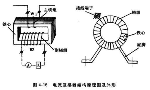 (2)電流互感器。電流互感器結構和電壓互感器相似,也由兩個繞組和鐵心組成。主次繞組W1與電路串聯,副繞組W2與電流表A、電流繼電器K等串聯。圖4-16為電流互感器結構原理與外形。電流互感器的作用是將大電流變成小電流供給儀表、電流繼電器等使用,因此,副繞組側的阻抗非常小,所以,電流互感器實質上是個工作于短路狀態的變壓 器,激勵電流非常小。主繞組側電流I1與副繞組側電流I2的比值稱為電流互感器的變化。