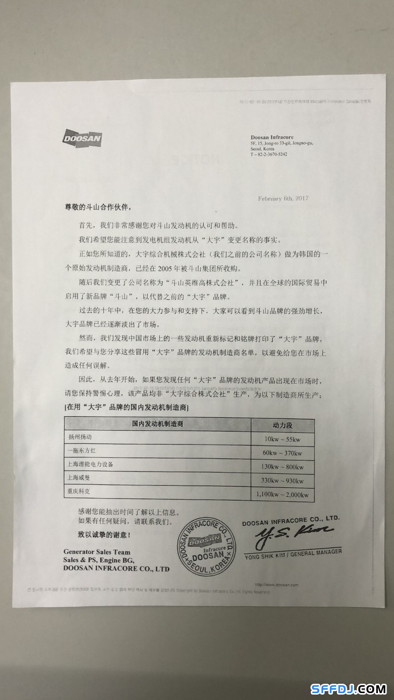 發(fā)電機(jī)組用發(fā)動機(jī)從“大宇”變更名稱為“斗山”名稱的事實(shí)。做為韓國的一個原始發(fā)動機(jī)制造商,已經(jīng)在2005年被斗山集團(tuán)所收購。