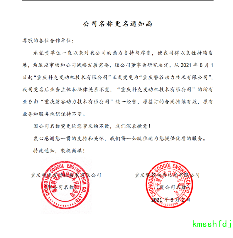 重慶科克發(fā)動機(jī)技術(shù)有限公司更名通知