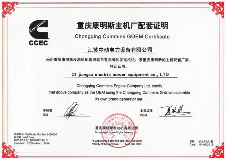 重慶康明斯動(dòng)力配套發(fā)動(dòng)機(jī)有限公司授權(quán)江蘇中動(dòng)電力設(shè)備有限公司作為柴油機(jī)配套商