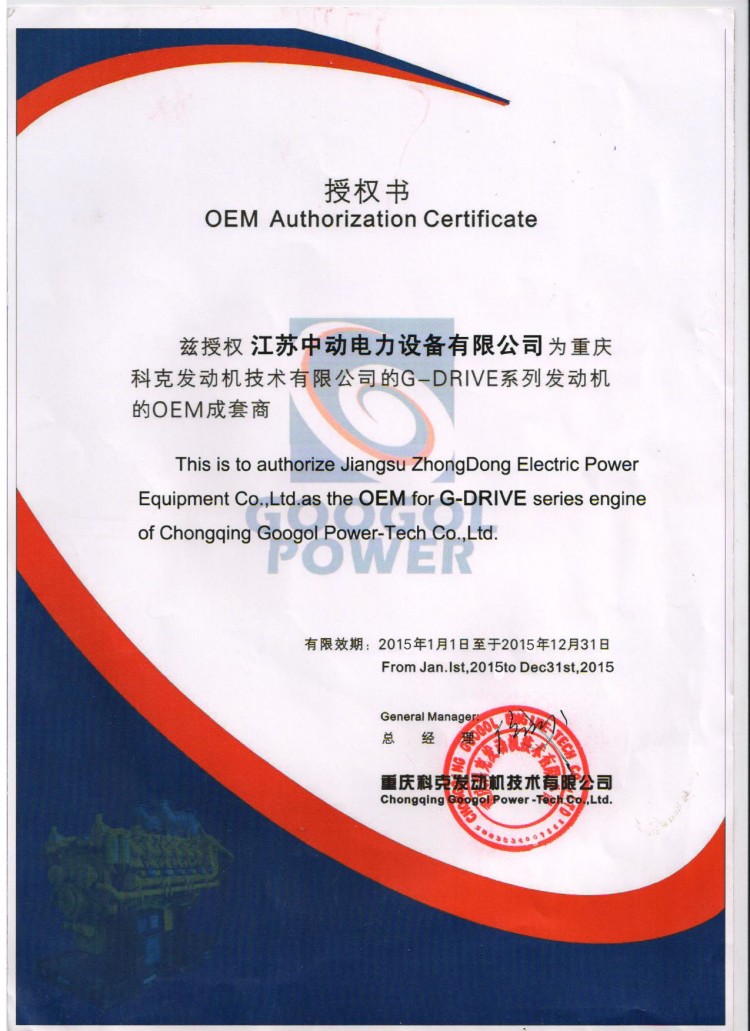 重慶科克發(fā)動機技術(shù)有限公司授權(quán)江蘇中動電力設備有限公司作為柴油機配套商