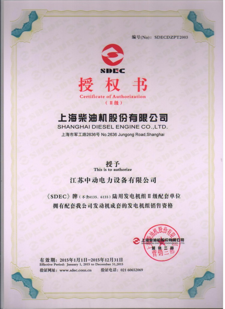 上海柴油機(jī)股份有限公司授權(quán)江蘇中動(dòng)電力設(shè)備有限公司作為柴油機(jī)配套商