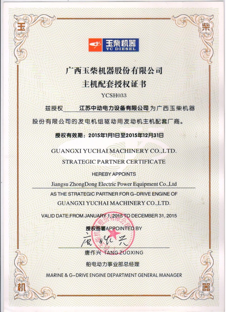 廣西玉柴機(jī)器股份有限公司授權(quán)江蘇中動電力設(shè)備有限公司作為柴油機(jī)配套商