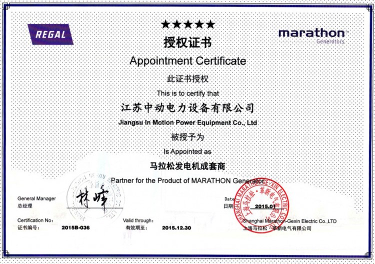 上海馬拉松革新電氣有限公司授權(quán)江蘇中動電力設(shè)備有限公司作為發(fā)電機(jī)配套商